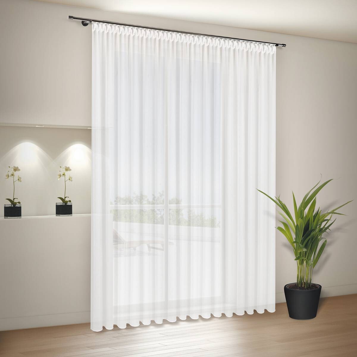 Er hat ein Maß von ca. 245 x 450 cm und besteht aus 100% Polyester. Durch sein intregiertes Smokeband und Bleiband ist er fix und fertig zum aufhängen!