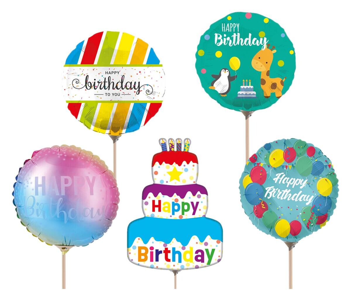 Unsere Mini-Folienballons bringen jeden Tag zum Strahlen. Ob als kleines Geschenk, Tischdeko oder einfach für gute Laune - die handlichen Ballons auf Stab gibt es in fünf fröhlichen Happy Birthday - Designs und einer Größe von ca. 15 - 23 cm (aufgeblasen). Perfekt für jedee Geburtstagsparty.