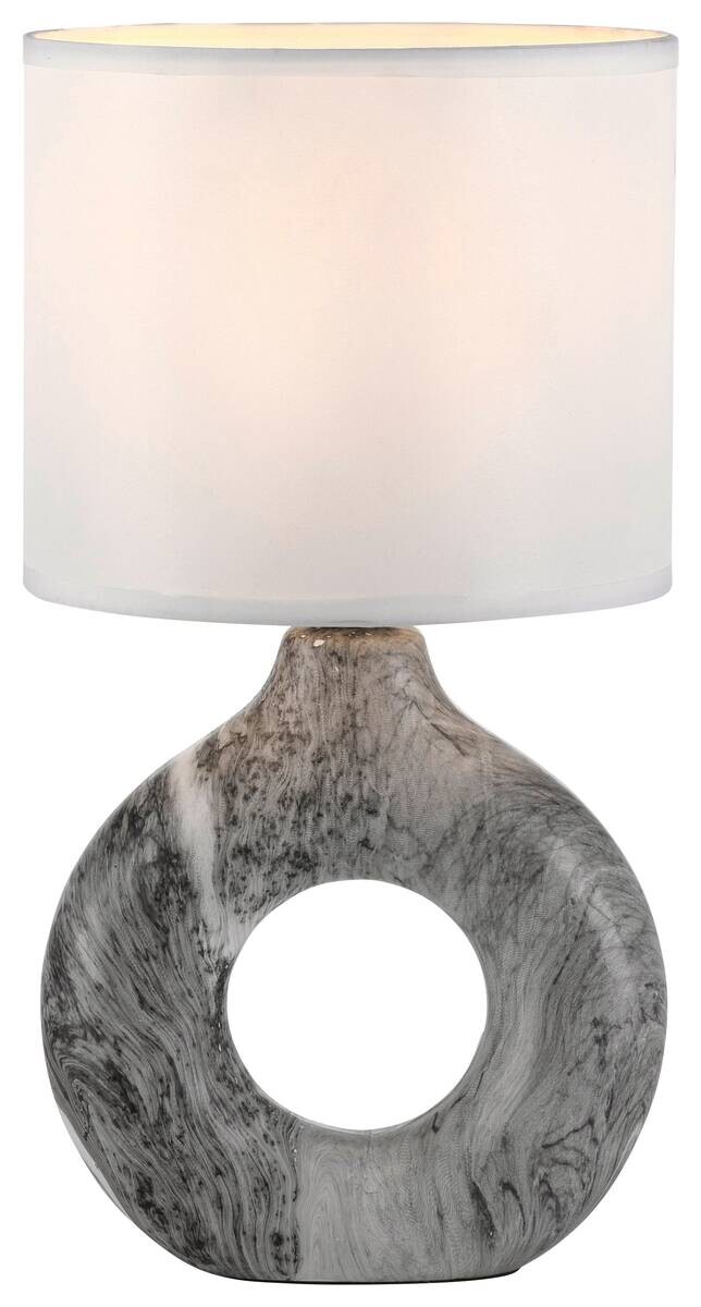 Die graue Tischleuchte CARARA überzeugt mit einem zeitlosen Design. Die Kombination aus einem Sockel in Marmor-Optik und einem weißen Stoffschirm verleiht der Leuchte einen besonderen Charme. Die Tischleuchte wird ohne Leuchtmittel geliefert. Sie haben die Möglichkeit die Leuchte mit einem E27-Leuchtmittel bis max. 25 Watt zu bestücken. Kombinieren Sie die Tischleuchte mit einem Leuchtmittel ganz nach Ihrem Geschmack. Über einen Schnurschalter können Sie die Leuchte bequem an- und ausschalten. Die kleine Tischleuchte findet garantiert schnell Ihren Einsatz als Nachttischlampe oder sie macht sich auch als Beistelllicht auf Sideboard, Tischen oder Fensterbänken sehr gut.