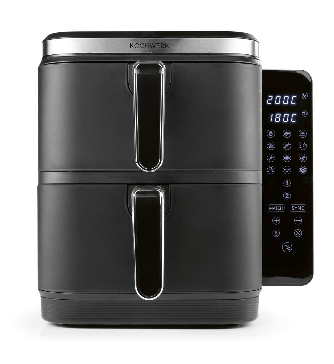 Ein schlankes Design, 2 Speisen auf 2 Ebenen gleichzeitig, mehr freier Platz auf der Arbeitsfläche und ein Volumen von 10 Litern für noch mehr Lieblingsspeisen! Zu schön, um wahr zu sein? Hier ist die KOCHWERK FryUp Doppelkammer-Heißluftfritteuse mit übereinanderliegenden Frittierkörben – 32 % schlanker* (*im Vergleich zur GOURMETmaxx Doppelkammer-Heißluftfritteuse 15436)! Das Multitalent für die Küche ist Ofen, Fritteuse & Grill in einem. Dank Sync & Match-Funktion kannst du die Garzeiten von verschiedenen Speisen synchronisieren und alles zeitgleich servieren oder die doppelte Menge in gleicher Zeit zubereiten. 12 voreingestellte Programme mit den idealen Zubereitungszeiten & Temperaturen sorgen für köstliche Resultate. Einfach das gewünschte Programm auf dem intuitiven und 90° flexibel anklappbaren LED-Touchdisplay wählen & zurücklehnen. Mit der KOCHWERK FryUp Doppelkammer-Heißluftfritteuse bekochst du mit Temperaturen bis 200 °C und 2800 W bequem die ganze Familie & Freunde – bis zu 8 Personen. Ob Frühstück, Mittagessen, Snacks oder Abendessen. Für die optimale Hitze-Zirkulation im Inneren sorgen 2 Heizelemente sowie 2 starke Ventilatoren. Und die automatische Shake-Reminder-Funktion erinnert dich nach der Hälfte der Zubereitungszeit daran, das Gargut zu wenden – für gleichmäßige & knusprige Ergebnisse. Die Frittierkörbe und die Einlegeroste sind antihaftbeschichtet sowie spülmaschinengeeignet. Entdecke mit der platzsparenden KOCHWERK FryUp Doppelkammer-Heißluftfritteuse die Freude am Kochen – fettarm & geruchsarm!