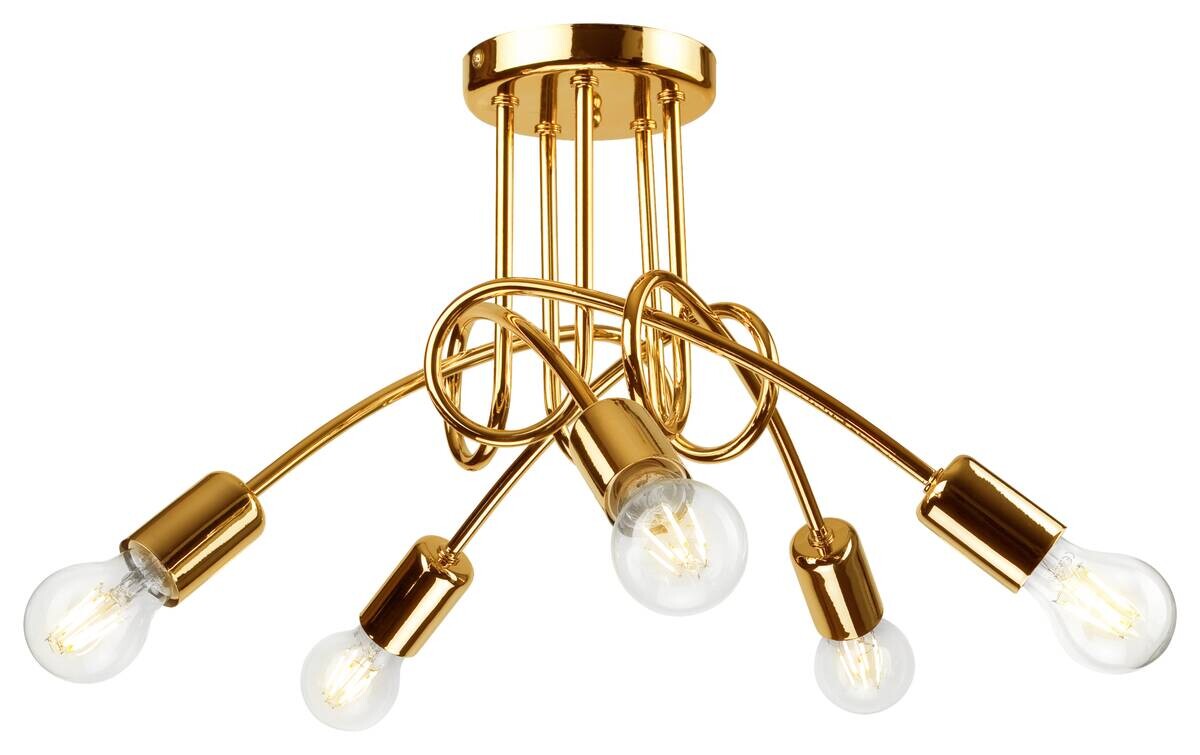 Bringen Sie modernes Flair in Ihre vier Wände mit der Deckenleuchte CAMILLA von LAMKUR. Made in EU, überzeugt diese Leuchte mit ihrem eleganten Design und hochwertigen Stahl in der Farbe Gold. Mit 60 Watt und 5 Brennstelle/-n ausgestattet, sorgt sie für eine optimale Beleuchtung in jedem Raum. Passend für 5 x E27 – ein Highlight für Ihr Zuhause. Maße: ca. 46 x 30 cm.
