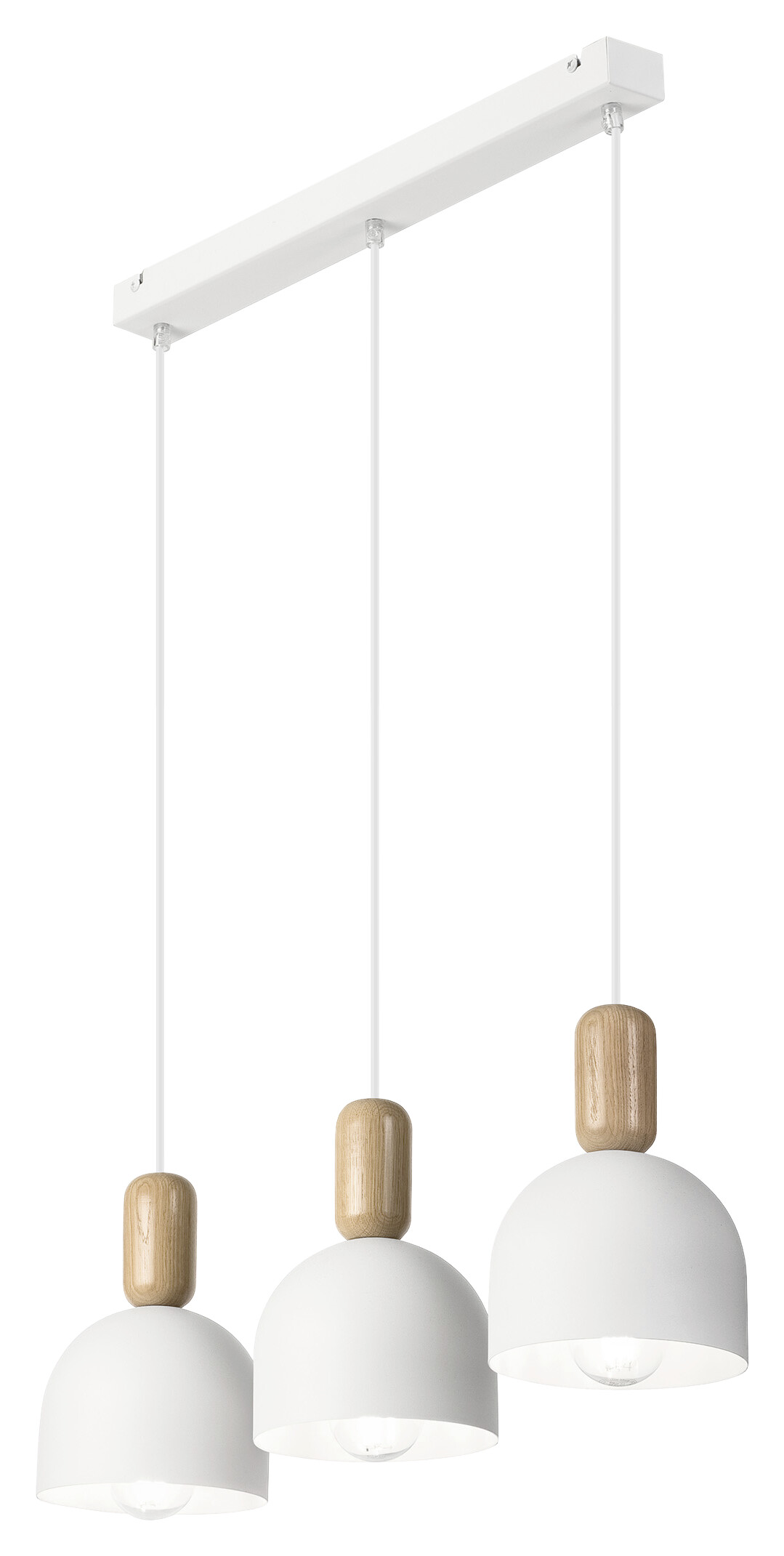 Die Hängeleuchte ALMA kombiniert weißen Stahl mit warmem Eichenholz und sorgt so für eine freundliche und stilvolle Atmosphäre. Mit drei E27-Brennstellen bietet sie eine gleichmäßige und angenehme Beleuchtung für Ess- oder Wohnbereiche.