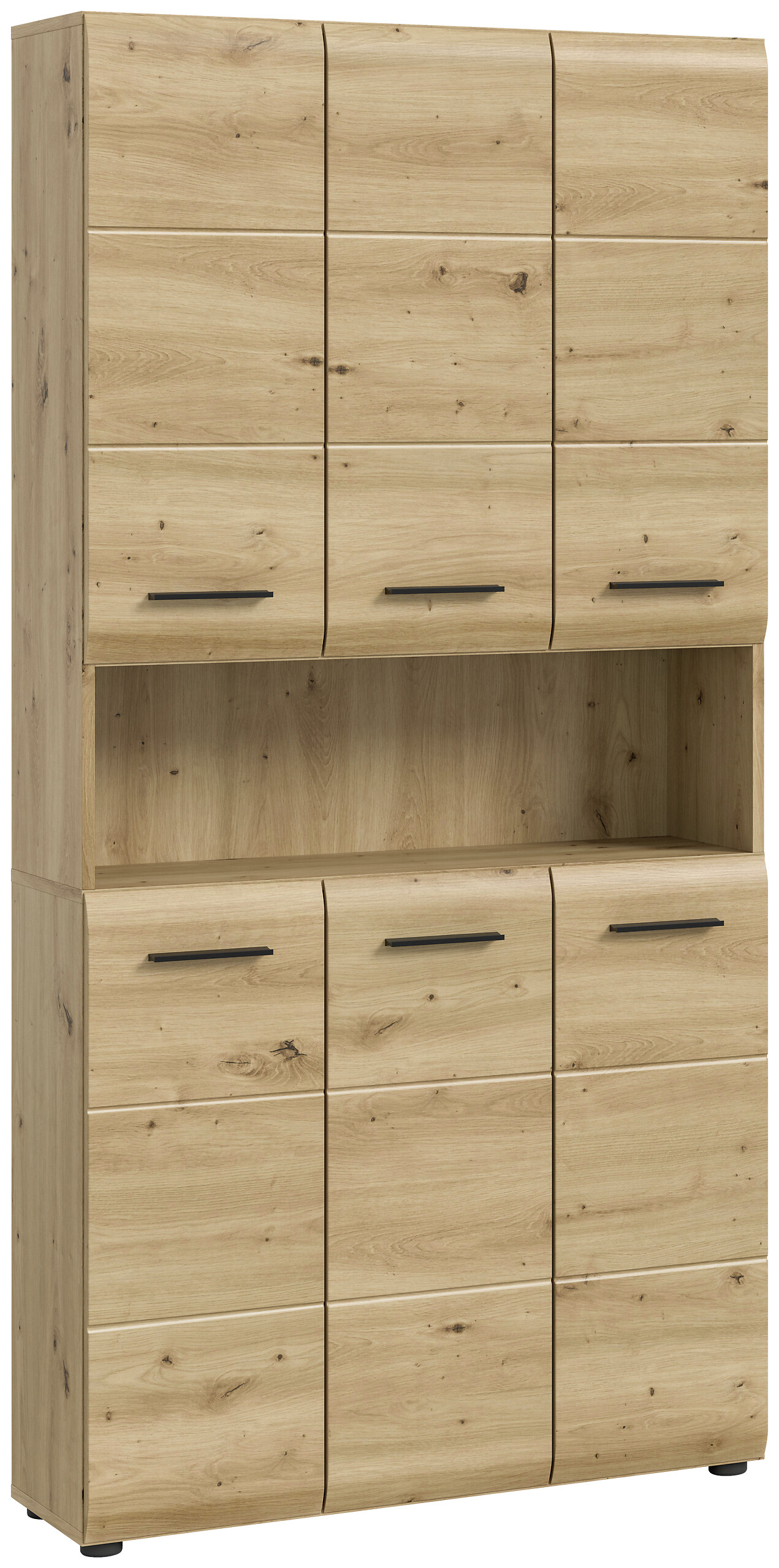 Der Mehrzweckschrank in Artisan Oak Nachbildung bietet mit sechs Türen, acht höhenverstellbaren Einlegeböden, zwölf geschlossenen Fächern, zwei Konstruktionsböden und einem offenen Fach viel Platz für deine Badutensilien. Die hochwertige MDF Front mit Rillenfräsung verbindet skandinavisches Design mit praktischer Organisation – für ein harmonisches Badambiente.