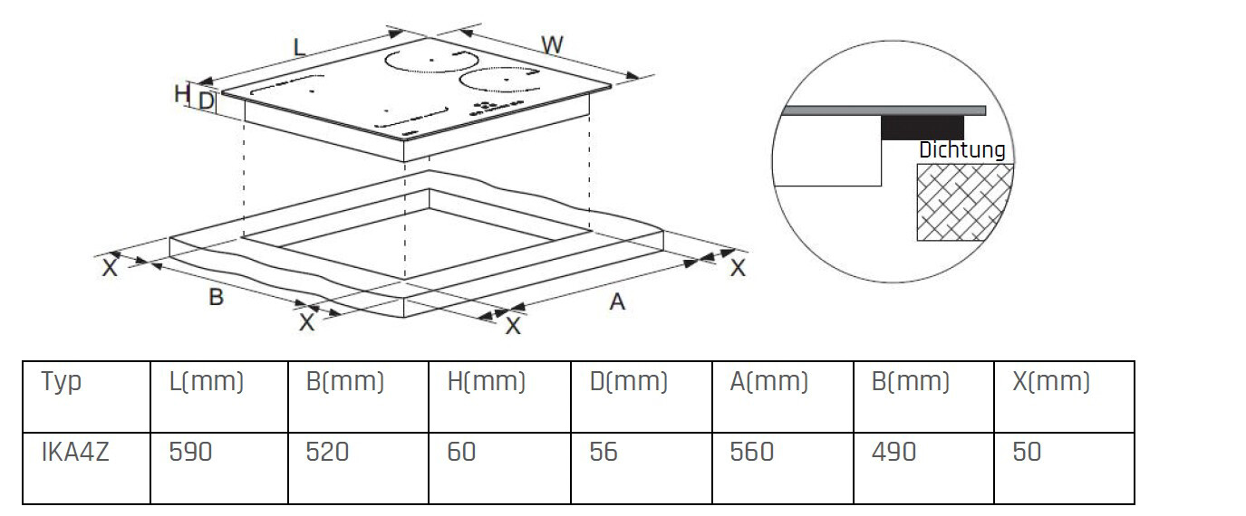 - Einbaumaße (B x T x H): 56 x 49 x 5,5 cm