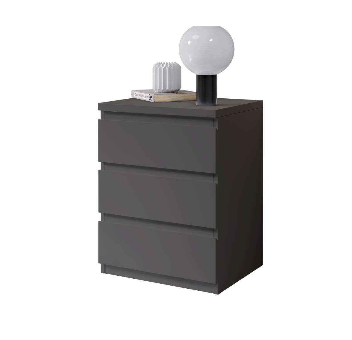 Geräumige Nachtkonsole in der Farbe graphit dient als praktische Ergänzung für Ihr Schlafzimmer. In 3 Schubladen haben Sie jeweils Stauraum für Magazine und Co. Ohne Deko.