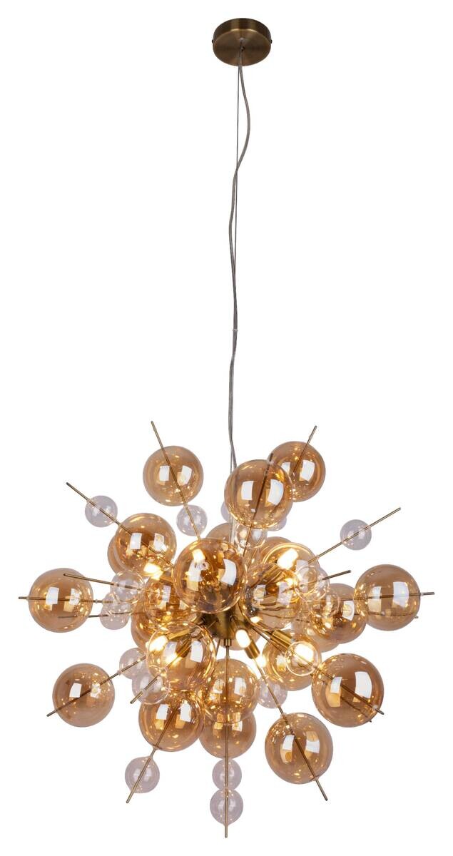 Diese Pendelleuchte aus der Kollektion EXPLOSION ist nicht nur funktional, sondern auch ein echtes Highlight für jede Wohnraumgestaltung. Mit Pendelleuchten erhalten Sie eine direkte und gezielte Beleuchtung, die optimal für die Beleuchtung von Esstischen, Kücheninseln, Arbeitsbereichen oder anderen Bereichen geeignet ist, die eine konzentrierte Lichtquelle benötigen. Sie akzentuieren bestimmte Zonen und schaffen eine klare Lichtquelle für alltägliche Aufgaben. Eine extravagant Optik und die kugelförmige Gestalt machen diese Leuchte im Modern Style zu einem unverzichtbaren Element für alle, die eine stimmige Einrichtung schätzen. Die Leuchte aus Metall und Glas in amber fällt sofort ins Auge. Die Kombination aus verchromtem Gestell und transparentem, klarem Schirm ergibt ein harmonisches Gesamtbild. Die Pendelleuchte misst 65 cm im Durchmesser und 150 cm in der Höhe. Zwischen 80 und 120 cm kann die Länge des Pendels nach Belieben eingestellt werden. Die Kabellänge beträgt 150 cm. Diese Pendelleuchte ist die perfekte Lösung für Ihre Innenraumbeleuchtung. Sie können das Leuchtmittel selber wechseln, das spart Zeit und Kosten. Diese Leuchte entspricht der Klasse 2. Für den Netzbetrieb dieses Geräts wird eine Netzspannung von 220-240V ~ 50Hz benötigt. Mit einer Leistung von 280 Watt ist diese Leuchte besonders leistungsstark und effizient. Die Leuchte hat folgende Sonderfunktion: Nein Verleihen Sie Ihrem Zuhause mit unserer hochwertigen Pendelleuchte das perfekte Lichtambiente und genießen Sie Komfort und Stil in jedem Raum.