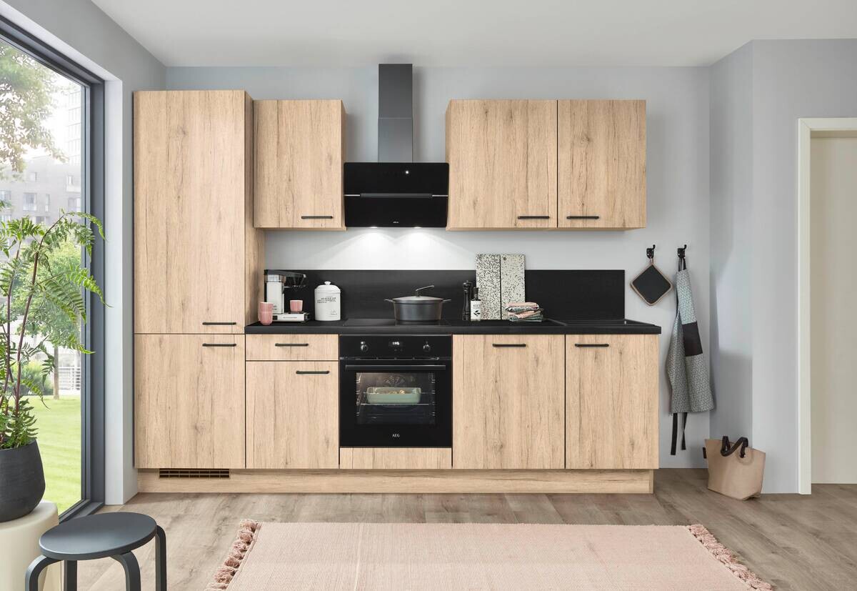 Der Küchenblock Speed überzeugt durch eine gelungene Kombination aus modernem Design und natürlicher Ausstrahlung. Die Fronten in der trendigen Farbe Schilf, einem natürlichen Grünton, harmonieren perfekt mit dem Korpus und der Arbeitsplatte in Eiche-Sierra-Nachbildung und schaffen ein warmes, wohnliches Ambiente. Horizontal ausgerichtete Metallgriffe in Schwarz setzen dabei markante Akzente und unterstreichen den zeitgemäßen Look der Küche.
