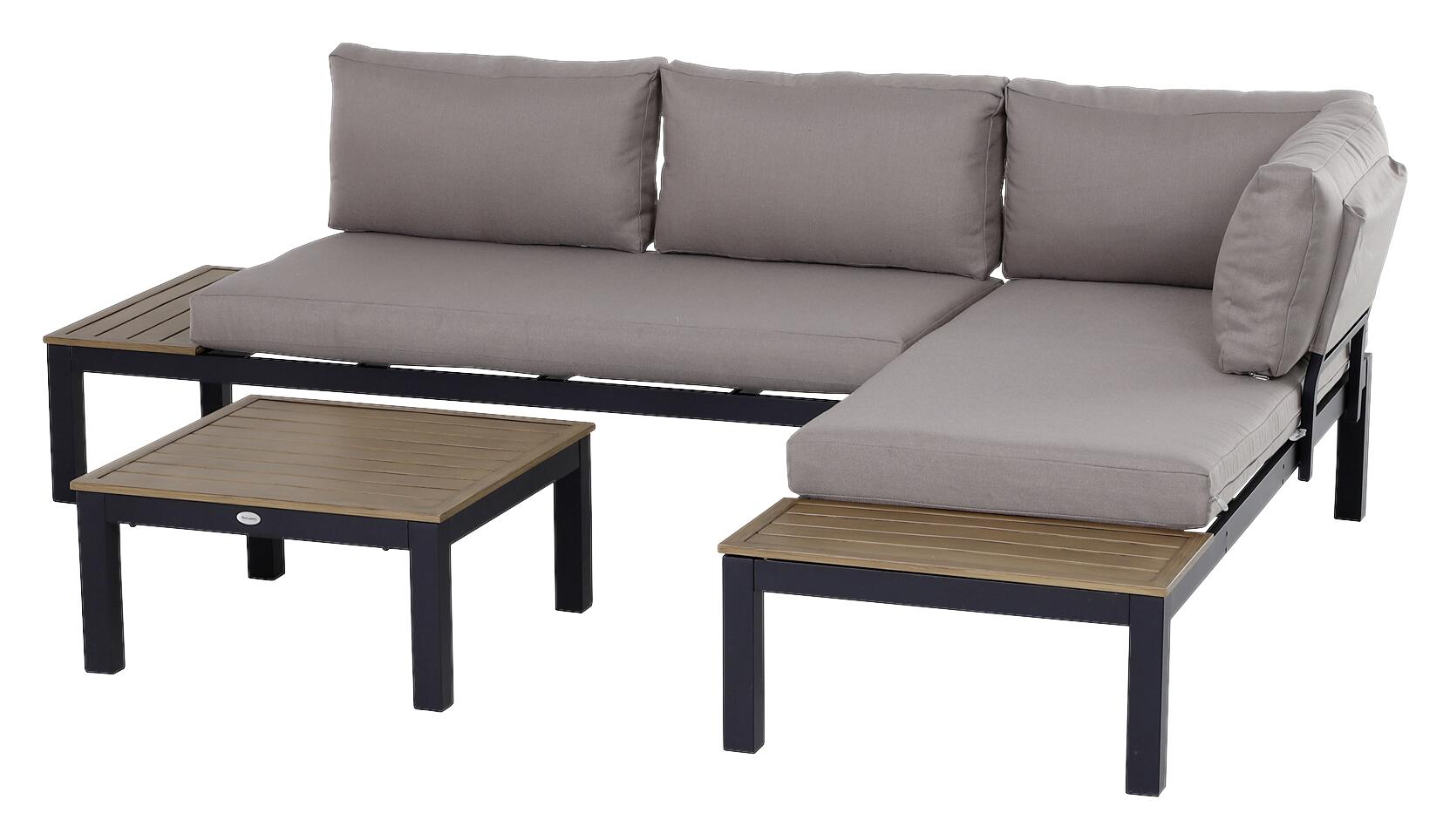 Mit diesem dreiteiligen Gartenmöbel Set können Sie sich wieder auf das Wesentliche besinnen. Der Aluminiumrahmen sorgt für Haltbarkeit und Festigkeit, ist rostbeständig und leicht, so dass Sie alles leicht transportieren können. Die dick gepolsterten Kissen an Sitz und Rücken sorgen für ein bequemes Sitzen, der Couchtisch im Lamellenmuster und das seitlich Tablett auf dem Sofa bieten viel Stauraum und können leicht gereinigt werden.