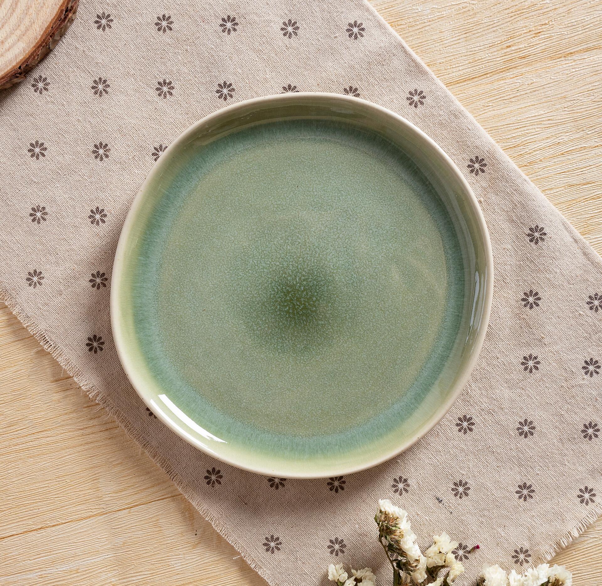 Mit ca. 20 cm Durchmesser eignet sich dieser Steingut-Teller ideal für Desserts, Vorspeisen oder kleine Mahlzeiten. Innen grün glasiert, außen hell – der sanfte Farbkontrast verleiht dem Teller eine frische, natürliche Ausstrahlung. Ein stilvoller Akzent auf jedem Tisch.