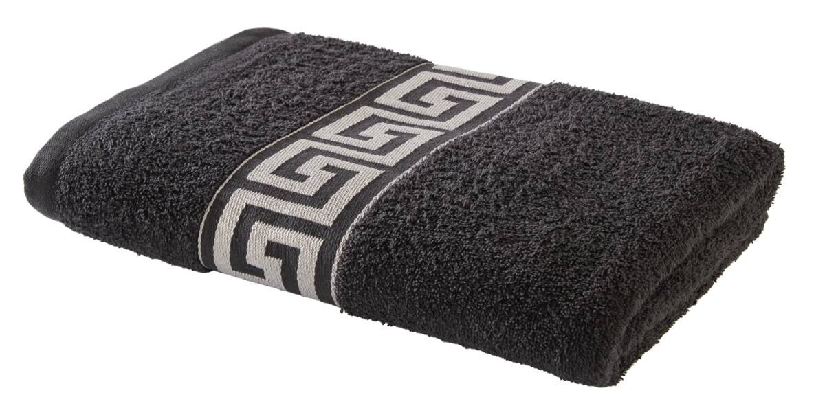 Hochwertiges Frottierduschtuch aus 100 % Baumwolle, welches durch die breite, aufwendige Mäanderbordüre ein besonderer Blickfang in jedem Badezimmer ist.