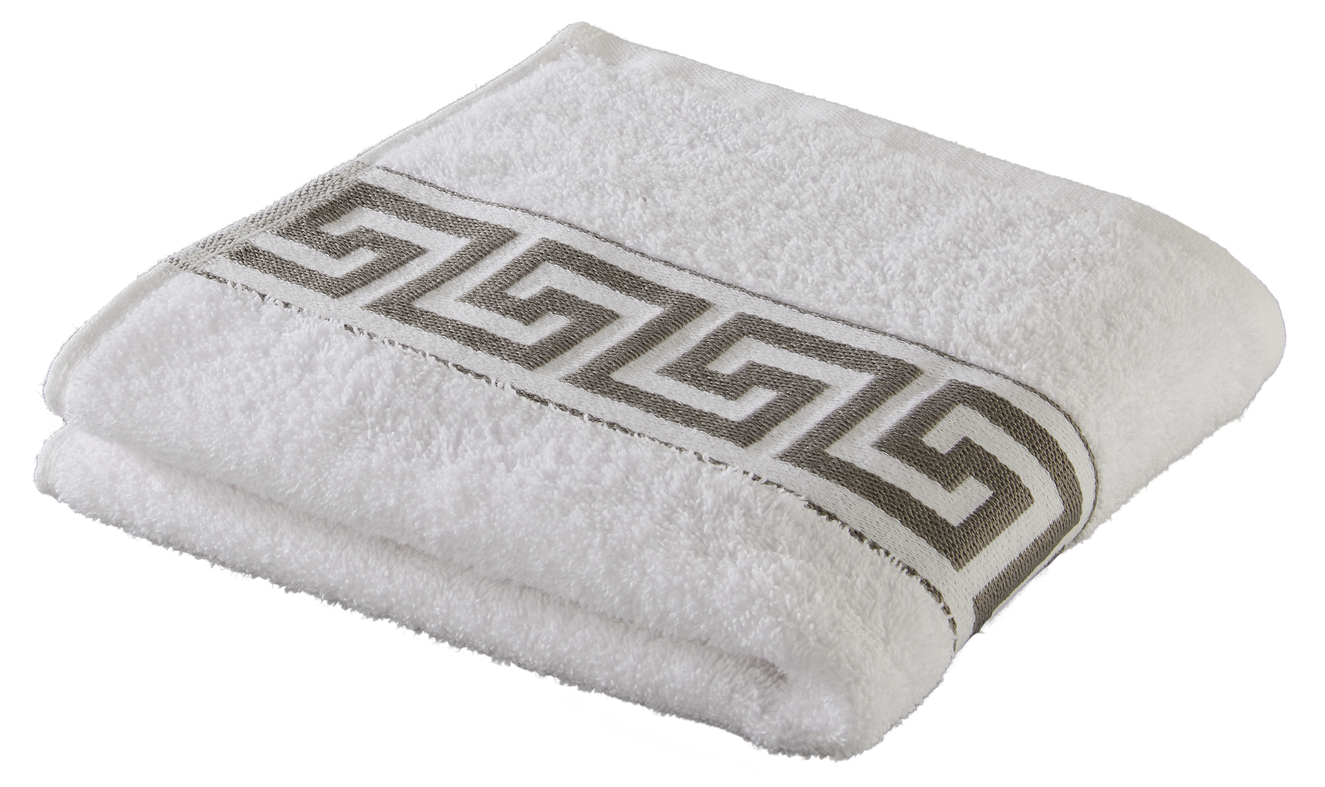 Hochwertiges Frottierhandtuch aus 100 % Baumwolle, welches durch die breite, aufwendige Mäanderbordüre ein besonderer Blickfang in jedem Badezimmer ist.