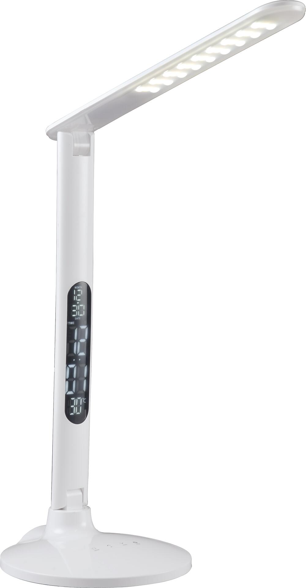 Die LED-Tischleuchte aus weißem Kunststoff ist ca. 50 cm hoch und ca. 19 cm breit. Die Tischleuchte hat einen ausklappbaren Leuchtenarm und ist schwenkbar. Sie hat ein LCD-Display in dem das Datum, die Uhrzeit und die Temperatur angezeigt wird. In der Leuchte sind 27 LEDs eingebaut, die jeweils 0,2 Watt haben und insgesamt hat die LED-Tischleuchte max. 5,4 Watt. Im Lieferumfang enthalten ist ein 5V DC Adapter mit 1200 mA.