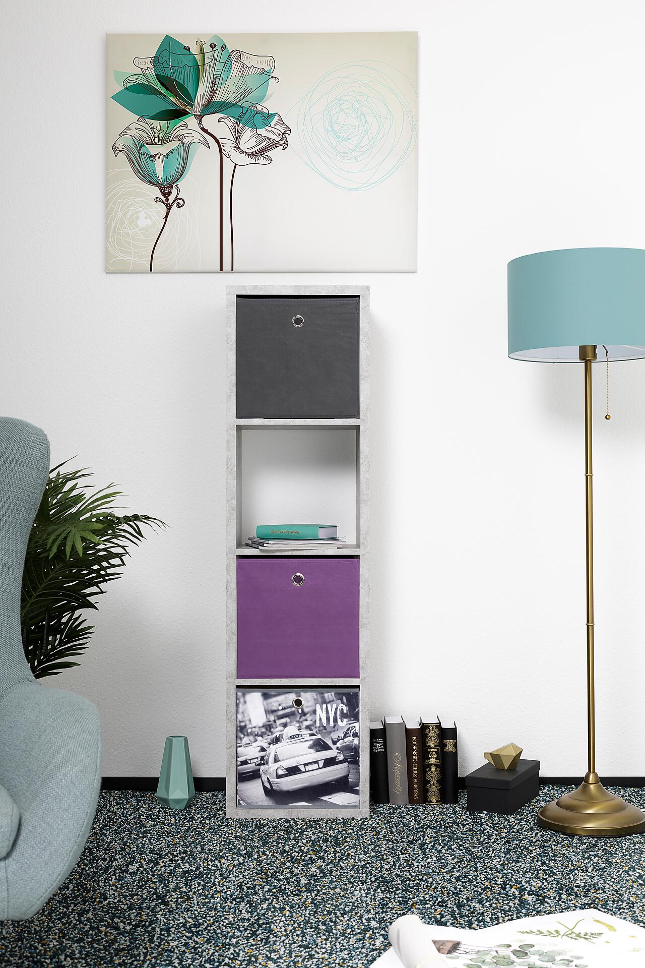 Stehend oder liegend. Unser praktisches Regal in Beton Optik kann beides. Vier Fächer eigenen sich wunderbar zum verstauen von Büchern, Ordnern oder diversem Kleinzeug in unseren passenden Faltboxen.