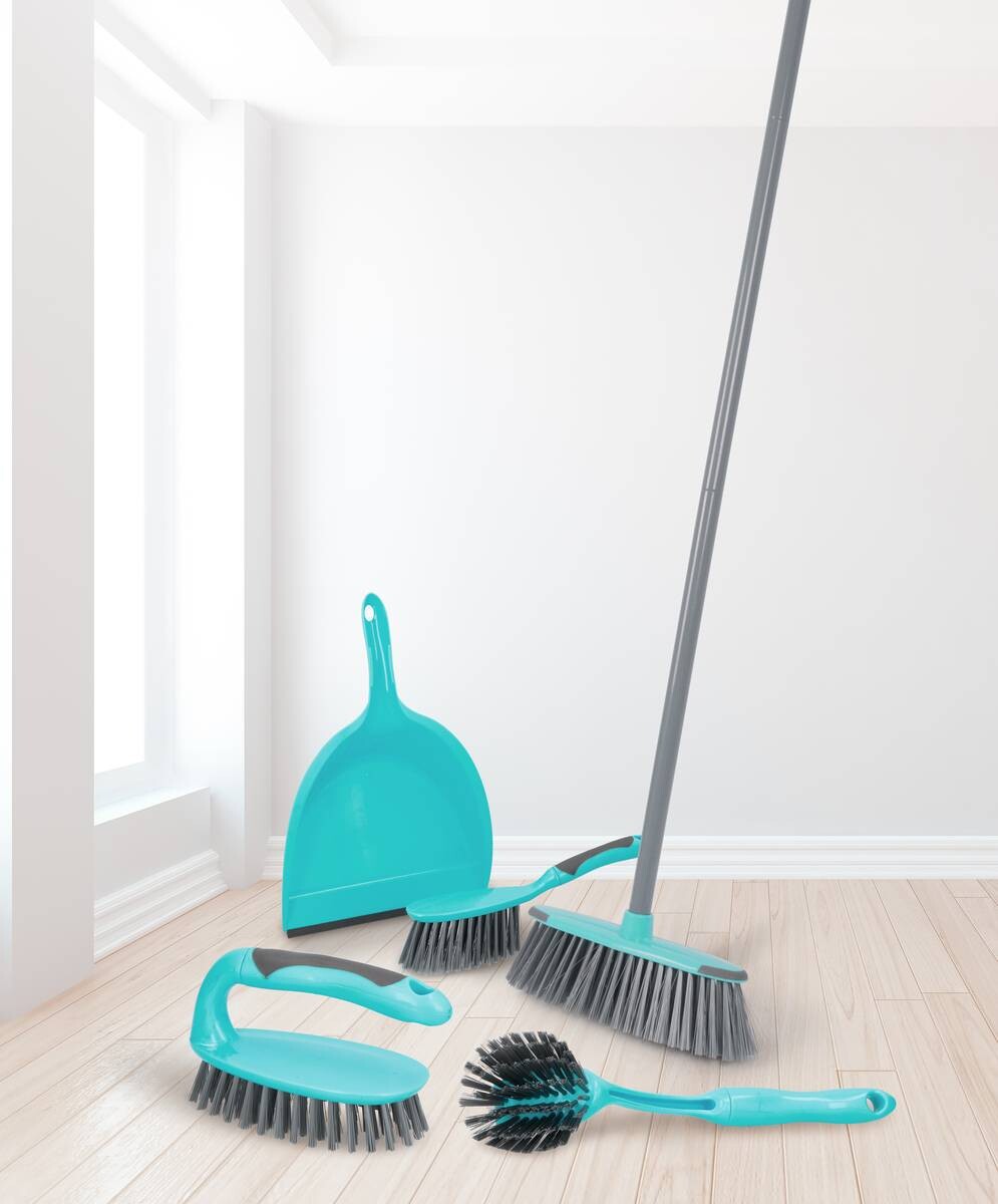 Reinigungsset mit Handfeger, Dose, Besen, Stiel, Handfeger und Spülbürste und somit perfekt für den Einsatz im ganzen Haus und darüber hinaus. Farbe: blau/grau.