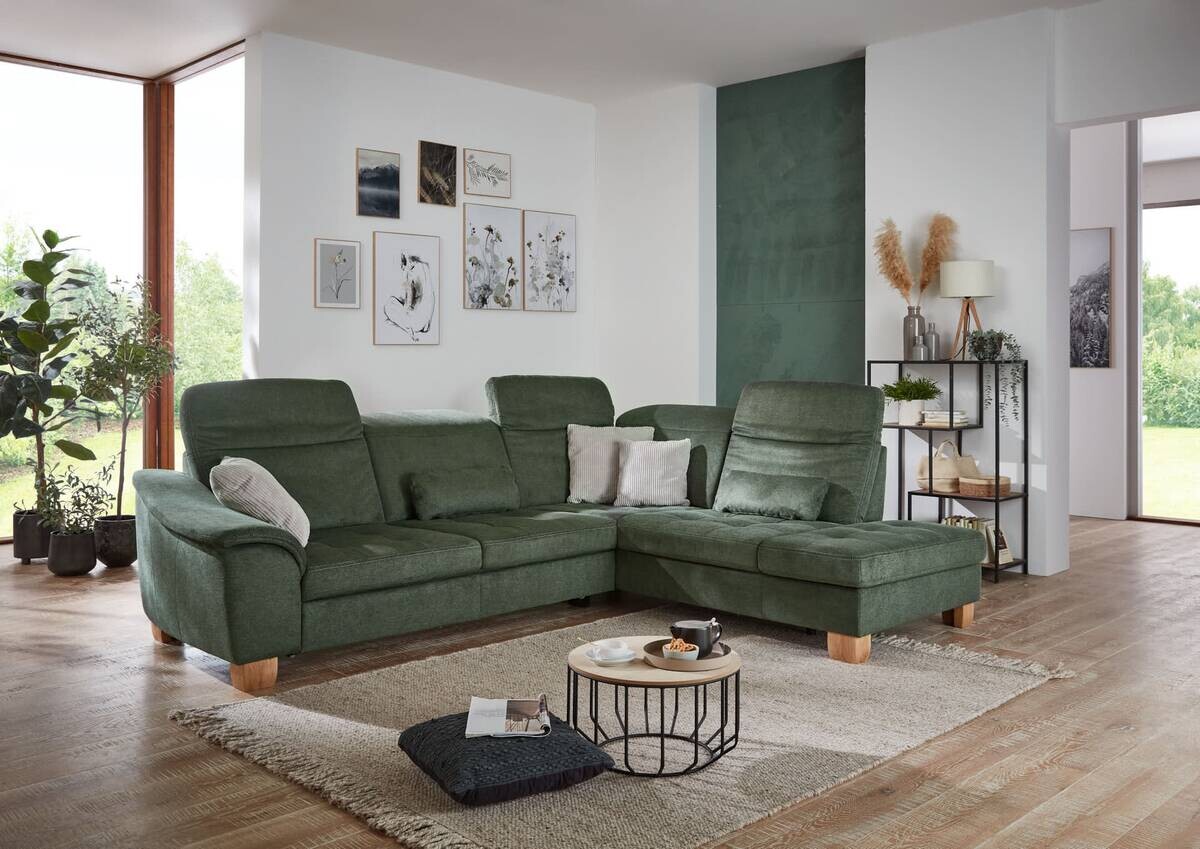 Von dieser elegante Rundecke werden Sie nicht mehr aufstehen wollen. Das angenehme Cyber moos Flachgewebe wird den Anforderungen mehr als gerecht. Einen guten Sitz- und Liegekomfort garantiert der hochwertige Federkern. Die Wohnlandschaft hat in der abgebildeten Variante eine Stellfläche von ca. 299 x 243 cm.