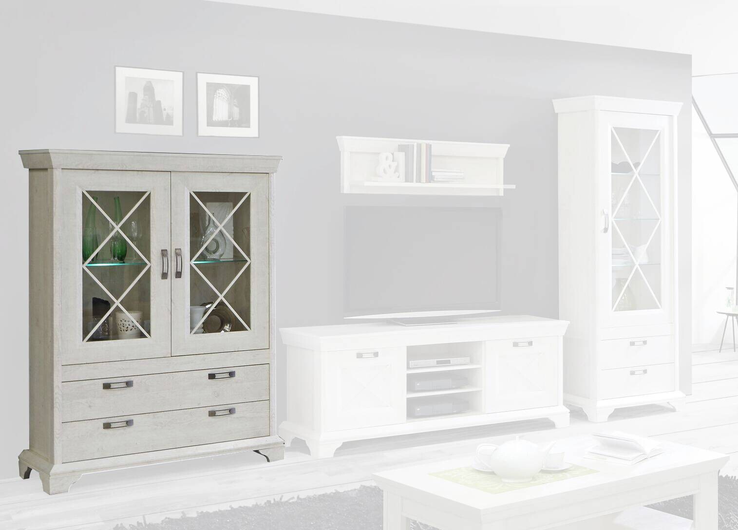 Der klassische Landhausstil zieht ein. Mit diesem imposanten Landhausprogramm können Sie Ihre individuellen Einrichtungswünsche erfüllen. Durch eine Vielzahl an einzeln bestellbaren Typen können Sie Ihr Wohnzimmer ganz nach Ihrem Geschmack einrichten. Der angenehme Farbton Pinia-Nachbildung weiß erzeugt eine ruhige Atmosphäre. Die hochwertigen Kranzabschlussprofile sorgen für einen stylischen Akzent. Die breite Vitrine (ca. 123 x 162 x 48 cm) verfügt über 2 Glastüren mit Rahmen und 2 breite Schubkästen. Die Glasböden der Vitrine lassen sich auf Wunsch in weiß oder Blau beleuchten. Die passende Beleuchtung können Sie separat bei uns erwerben.