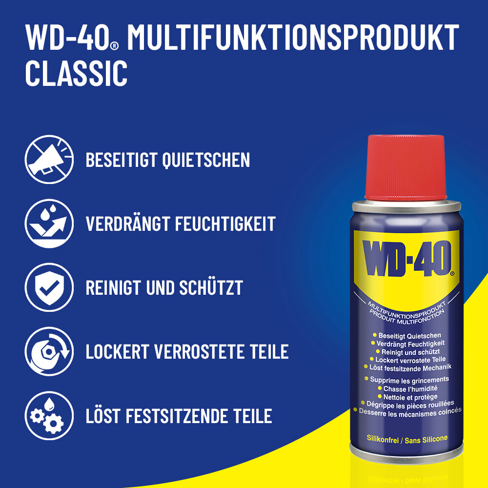 WD-40® Multifunktionsprodukt unterwandert und lockert verrostete und festsitzende Schrauben. Es dringt bei Scharnieren in die Gewinde ein und schützt vor Korrosion. WD-40® Multifunktionsprodukt verdrängt Feuchtigkeit, schmiert und beseitigt Quietschen.