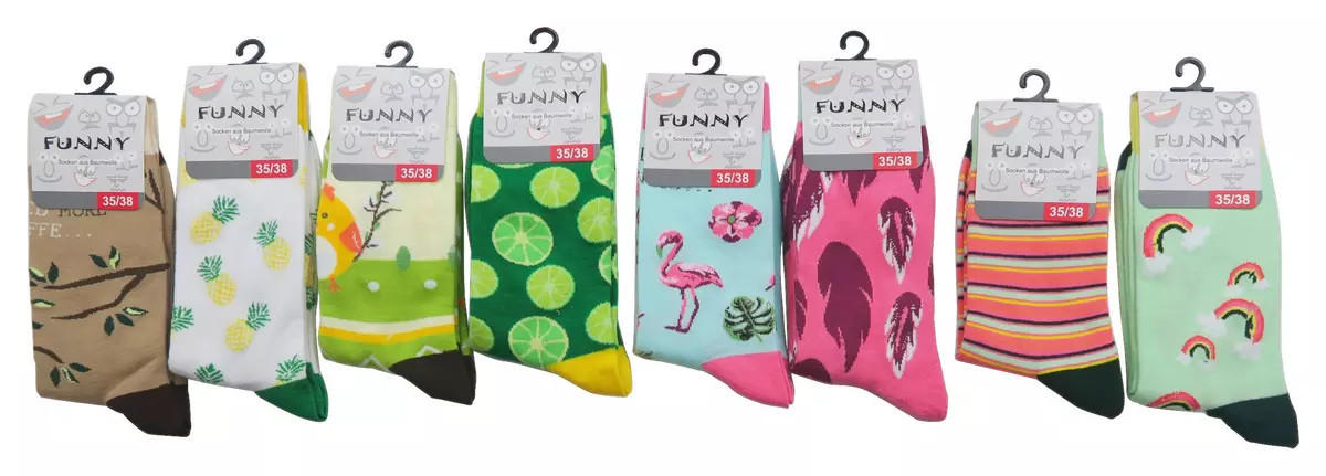 Frauen mögen es dagegen häufig bunt. Voll im Trend liegen Sie gerade mit gemusterten Varianten in leuchtenden Farben: Bunte Punkte, Ringelstreifen oder beides gemischt sind ebenso dabei wie bestimmte Motive. Ob Ananas, Fußball oder Teddybär, der Fantasie sind keine Grenzen gesetzt. Besonders gut kommen Ihre farbenfrohen Modesocken zur Geltung, wenn Sie Ihre Hosenbeine umschlagen oder kürzere ⅞-Hosen tragen.